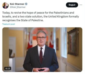 > “Hoy, para reavivar la esperanza de paz para palestinos e israelíes y de una solución de dos Estados, el Reino Unido reconoce formalmente al Estado de Palestina”.