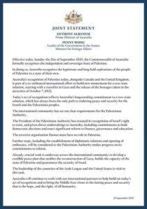 De manera paralela, los gobiernos de Canadá y Australia emitieron comunicados oficiales confirmando el reconocimiento diplomático de Palestina, señalando que se trata de un acto necesario para avanzar hacia la paz y el respeto del derecho internacional.