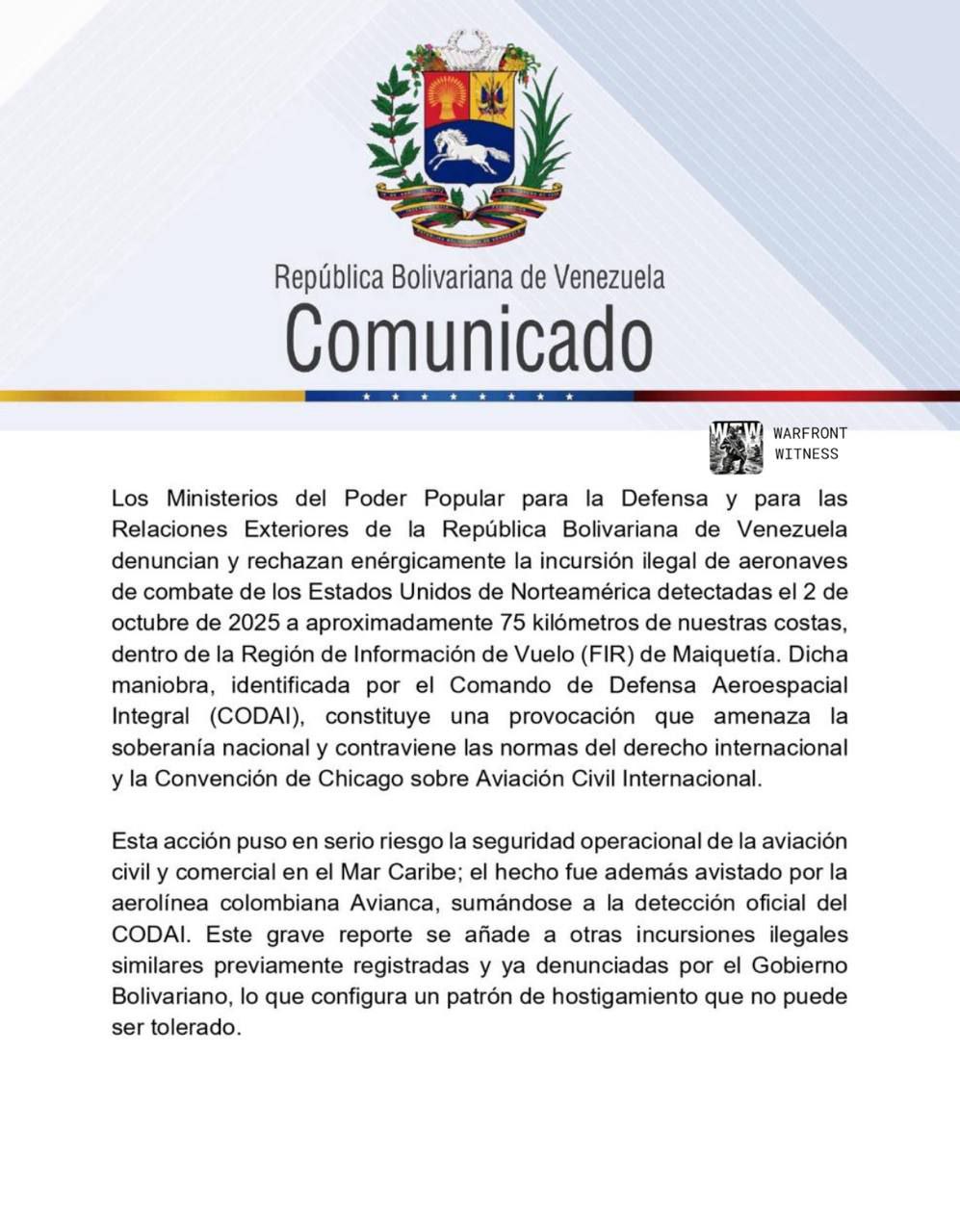 El gobierno bolivariano calificó la acción como una “incursión ilegal”, una “provocación” y una amenaza a la soberanía nacional. En un comunicado conjunto, los ministerios de Defensa y Relaciones Exteriores advirtieron que denunciarán el hecho ante organismos internacionales como la ONU, la OACI, la CELAC y otros. (Al Jazeera)